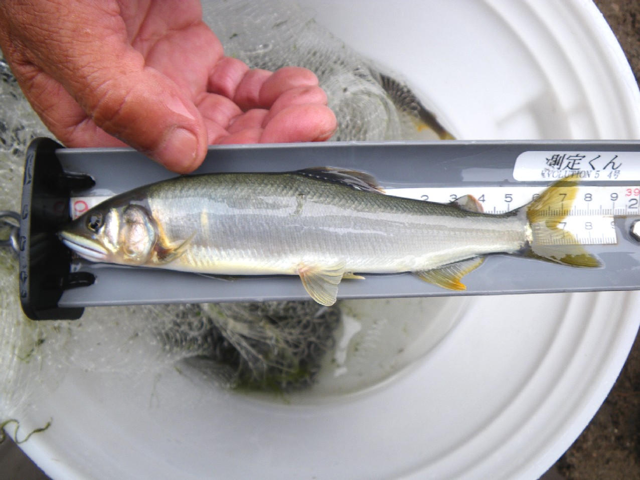 いすれの場所でも、投網1投で10匹ほどのアユが獲れ、18cm以上の大型のアユもみられました。