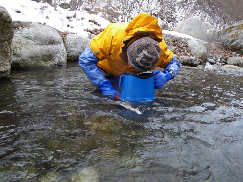秋に産み落とされた卵の孵化状況を調べるため、産卵床と呼ばれる卵の入っている小石の山を、そっと掘り起こします。